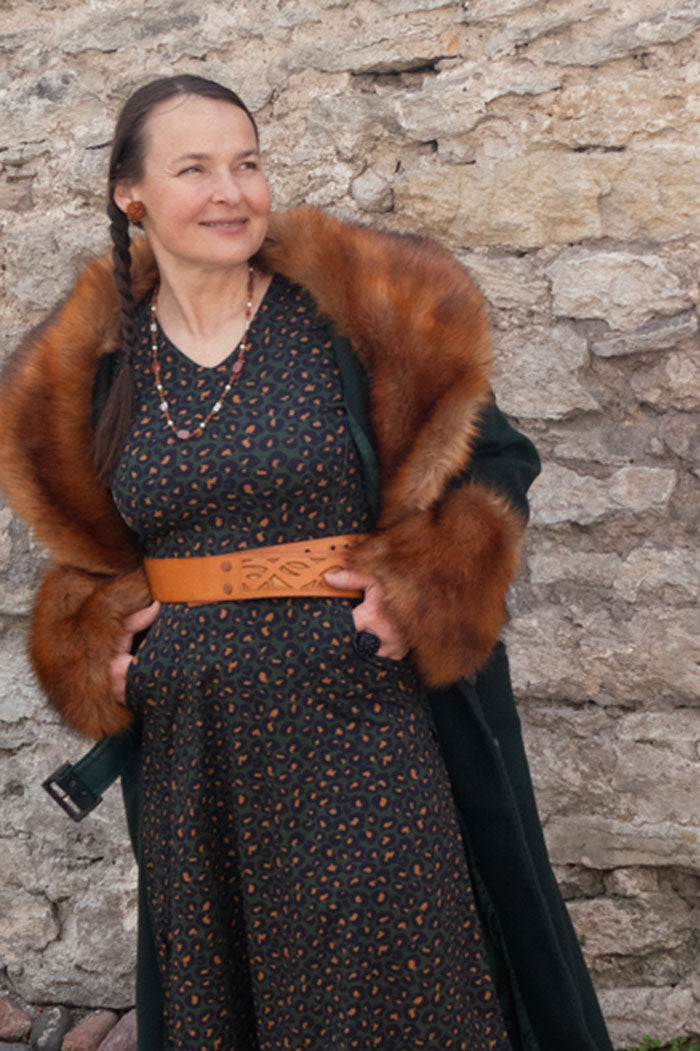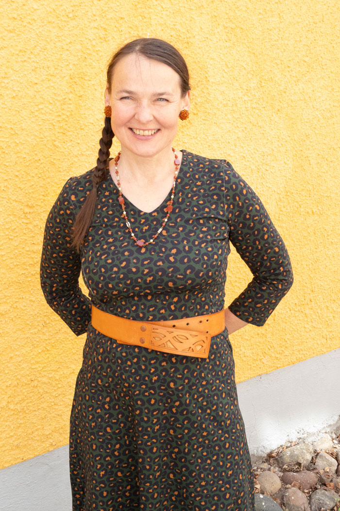 Ingrid är en tidlös klassiker med en mjukt figurnära siluett som känns både bekväm och elegant. Det vackra Leopold Green mönstret ger klänningen en naturlig och lugn karaktär, och tyget – mjuk ekologisk bomulls­trikå – omsluter kroppen med värme och kvalitet.