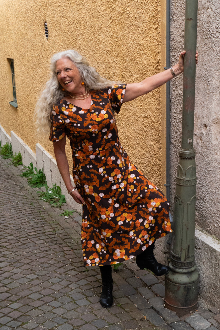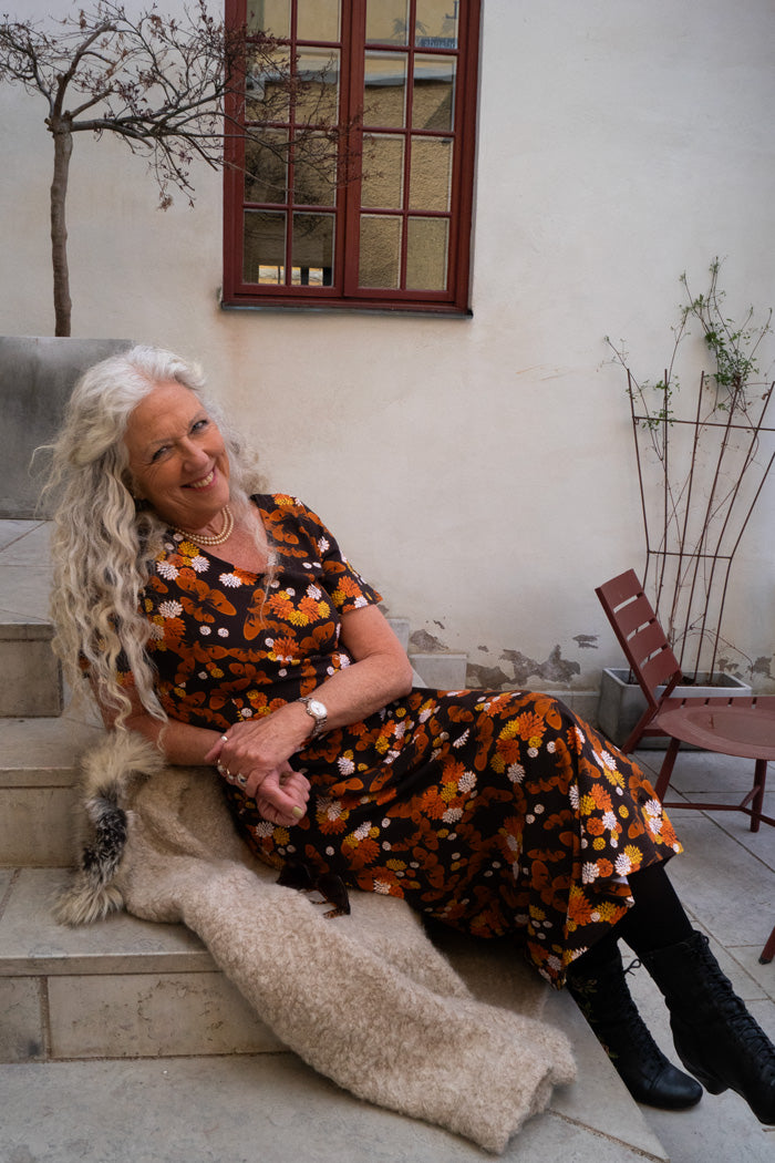 Kerstin är en klänning från vår egen kollektion och är designad här i Visby av vår egen Sara Högblom. Klänningen är designad med Saras mormor Inez syster Kerstin i åtanke, som gärna klädde upp sig tjusig och flärdfullt till vardag och fest. Designen är inspirerad från 40-50-talet och andas av en skön retro-romantik.