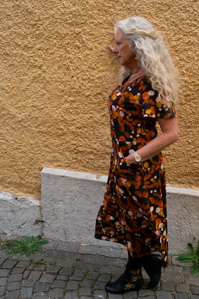 Kerstin är en klänning inspirerad av kvinnliga former och har en vacker urringning med v-form både fram och bak. Skön smickrande passform i mjukt trikåtyg med bystinsnitt och markerad midja. Självklart har den fickor fram. Längden på klänningen är en av våra längsta och går till vaden. Formen på ärmen är lätt utställd för en klockad form och är halv lång till strax ovan armbåge.