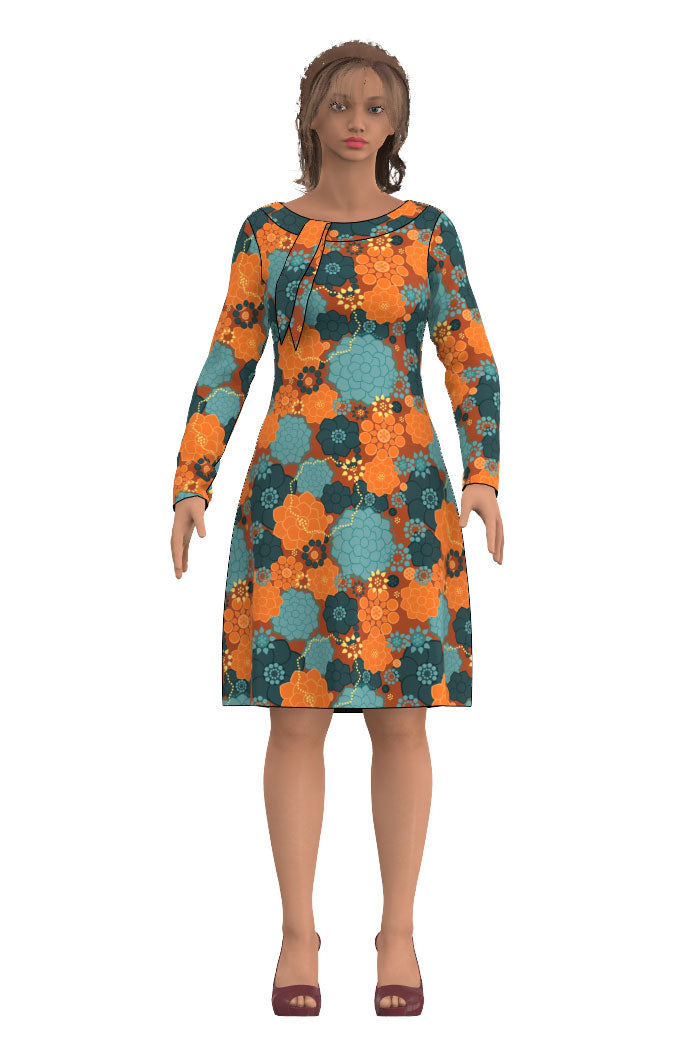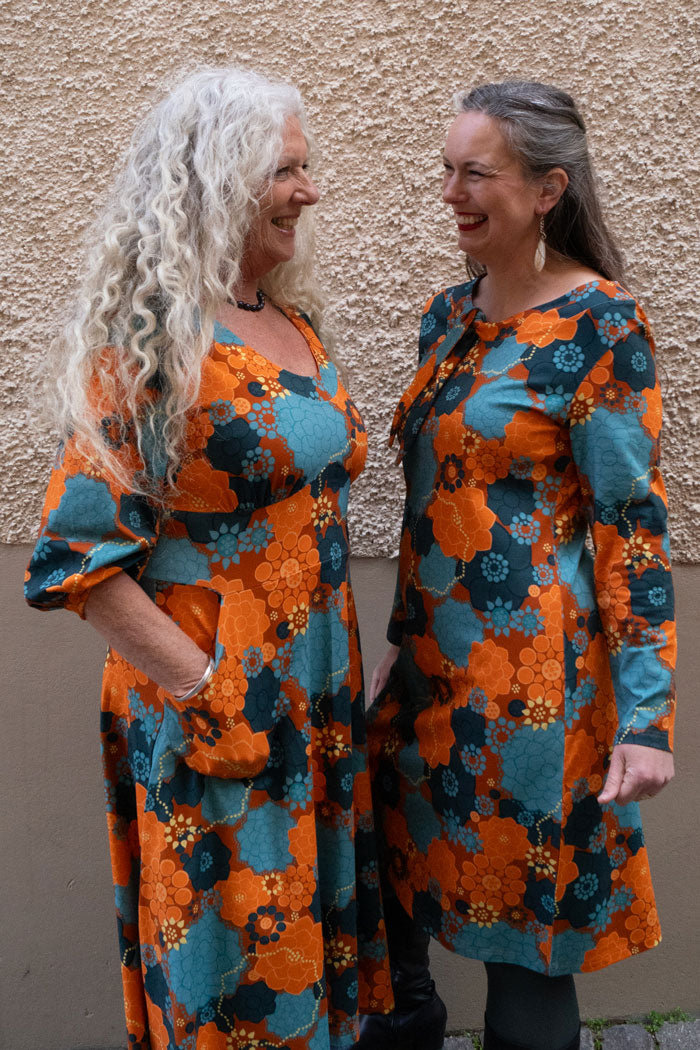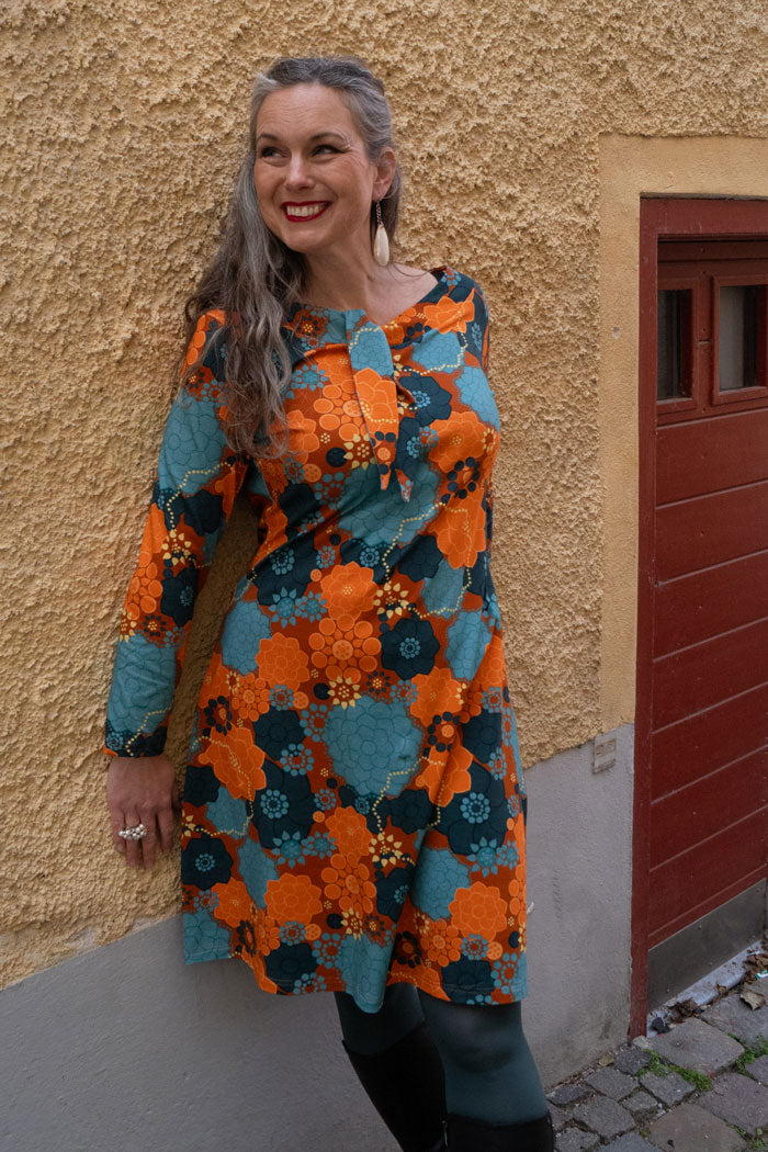 Tyget är mjuk ekologisk bomull med varm, höstig orange nyans. Den vackra knytkragen ger en feminin och stilren detalj som framhäver halslinjen, medan den A-formade siluetten skapar ett smickrande, lätt fall över kroppen. Den lediga passformen gör klänningen bekväm att bära hela dagen, samtidigt som den behåller ett elegant och tidlöst uttryck.