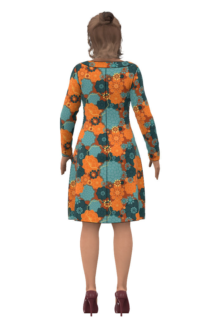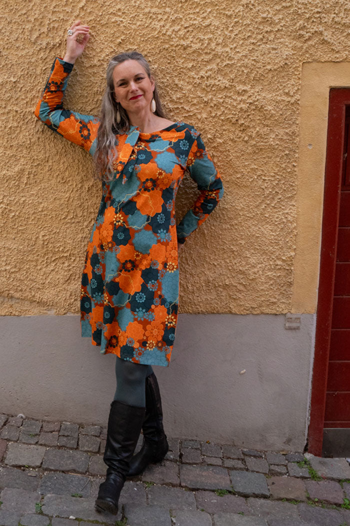 Sanna Hammock orange är en elegant, mjukt formad klänning med en klädsam krage inspirerad av klassisk sjömanskrage och vintage flygvärdinnestil.