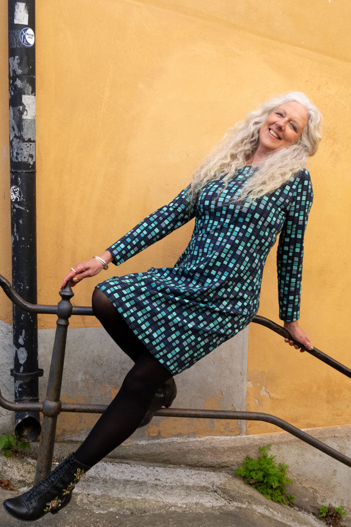 Sara Beads Blue är en mjukt skuren klänning med en vacker, avslappnad passform som faller lätt – idealisk för dig som vill känna dig bekväm och elegant på en och samma gång. Tyget är GOTS‑certifierad ekologisk bomull, med ett pärlmönster i blå nyanser som tillför både lekfullhet och karaktär.