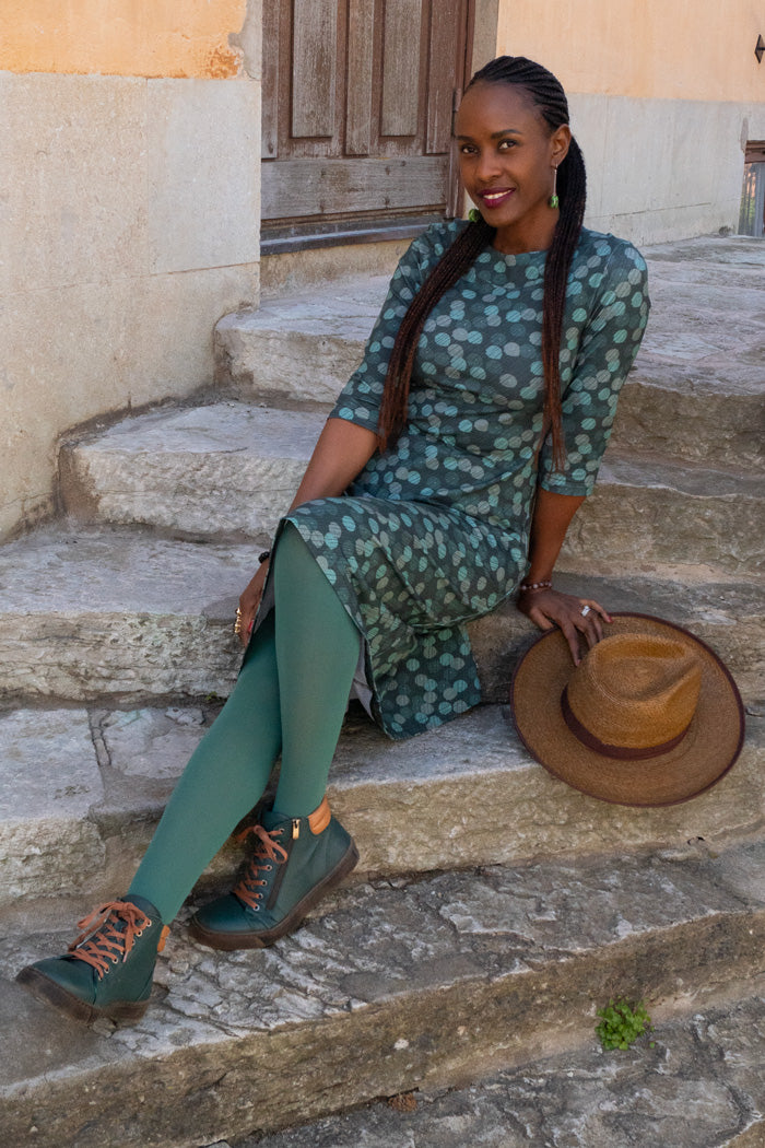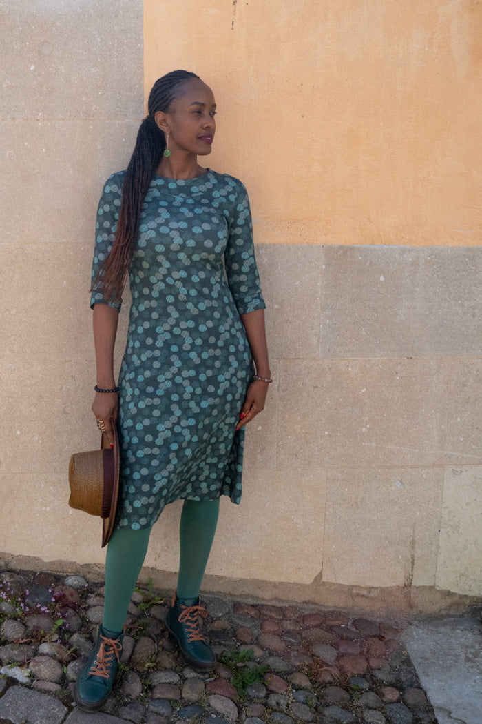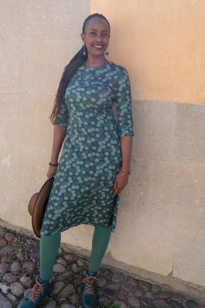Signe Umbrella Green är en knälång, A‑formad klänning i mjuk ekologisk bomull som ger en smickrande och följsam siluett. Den eleganta båtringningen framhäver hals och axlar, medan de trekvarts långa ärmarna ger ett lätt och ledigt uttryck som passar många tillfällen.