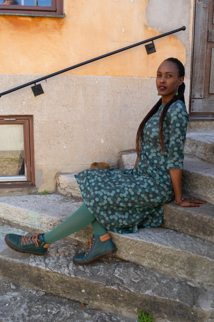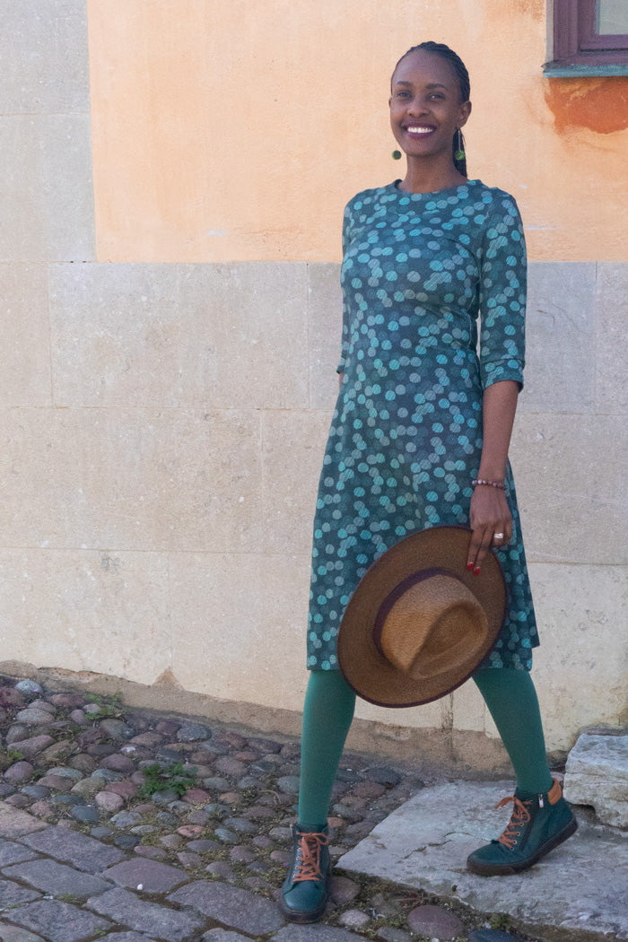 Den A‑formade kjolen är lätt vid och rör sig vackert vid varje steg, och det färgglada paraplymönstret i gröna nyanser ger klänningen ett lekfullt och färgstarkt uttryck. Signe Umbrella Green finns i plussize‑storlekar och är producerad lokalt i Visby, vilket gör den till ett medvetet slow‑fashion‑plagg som fungerar lika bra till vardag som till festliga tillfällen.