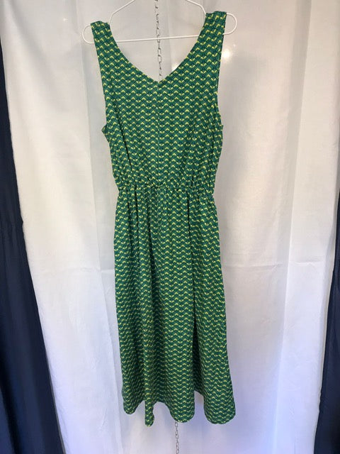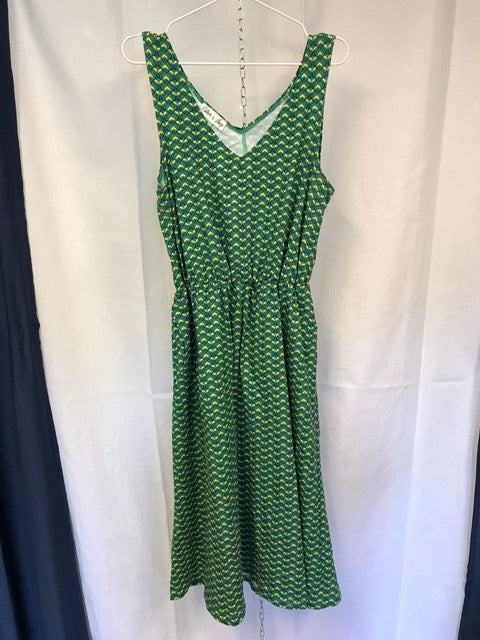 En somrig klänning med V urringning fram och bak och sidfickor och midjeskärning med resår ihop med vidd i kjolen. Kjolen går ner ungefär till övre delen av vaden. Passformen i klänningen är tajt upptill med lös passform över mage och stuss.