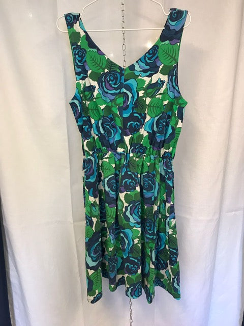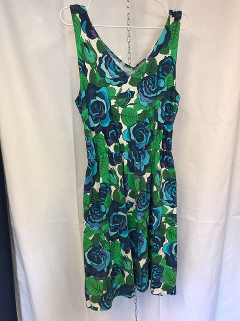 En somrig klänning med V urringning fram och bak och sidfickor och midjeskärning med resår ihop med vidd i kjolen. Kjolen går till nedre delen av låret. Passformen i klänningen är tajt upptill med lös passform över mage och stuss.