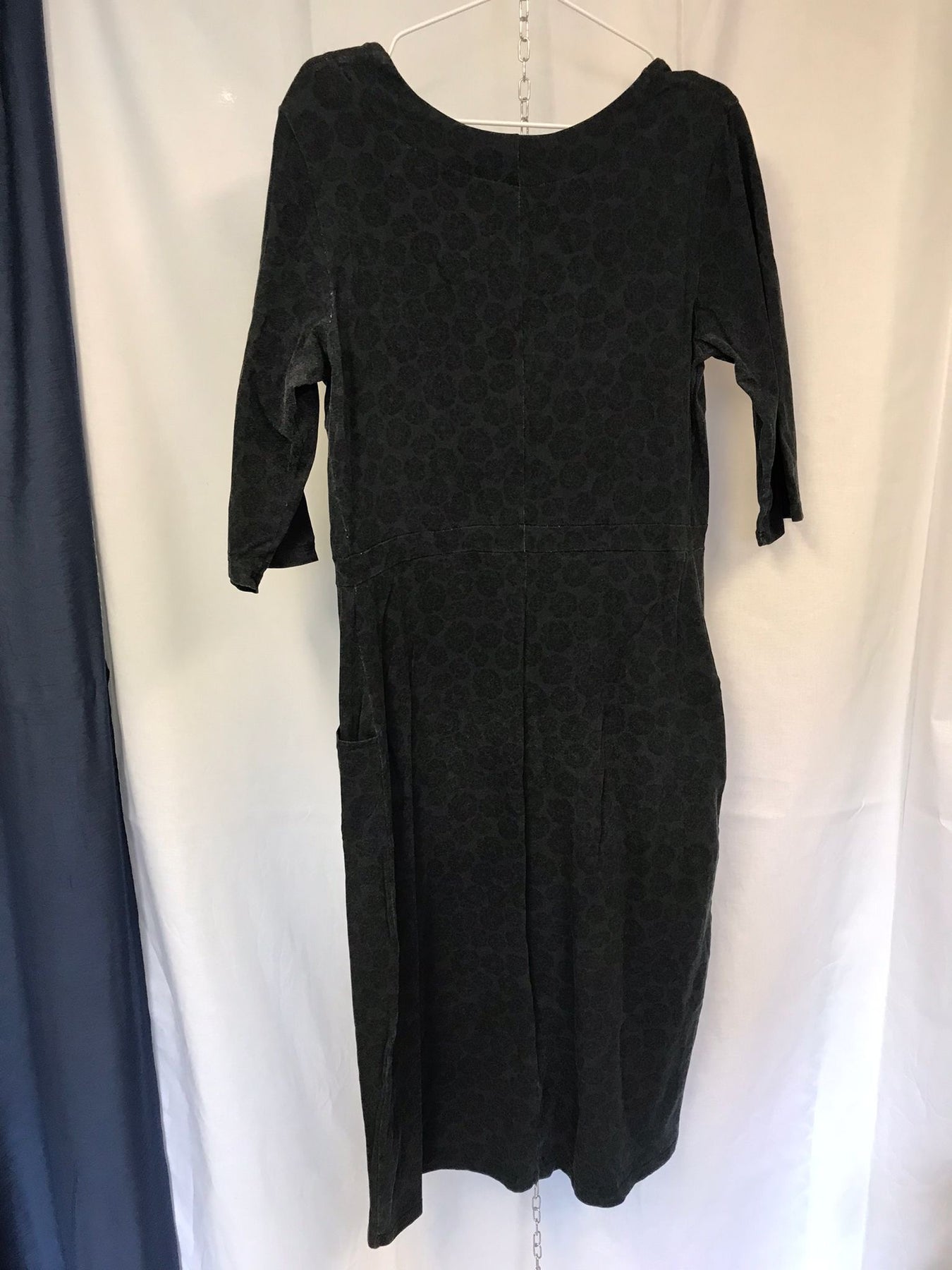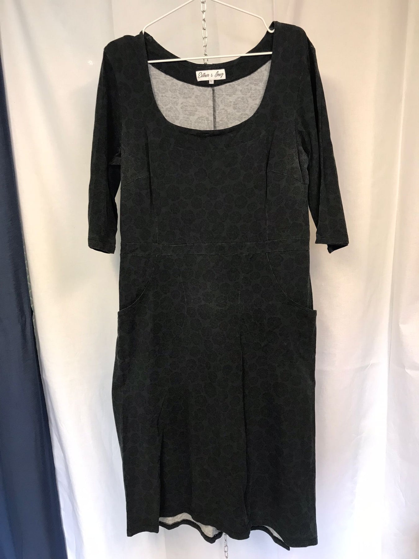 Inez har en djup urringning som passar bra med en balconette-bh och snygga halsband. Bystinsnitt för att optimera passformen och praktiska fickor fram som löper i linje med bystinsnitten. Längden går till vaden och passformen i klänningen är tight upptill och med lite lösare kjolpassform. Kjoldelen är rak från stussen och ner. Ärmlängden går ner till övre delen på under armen, en så kallad trekvartsärm.