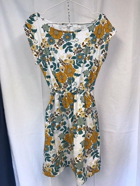 Kim har båthalsurringning fram- och baktill. Sidfickor och midjeskärning med resår ihop med vidd i kjolen. Kjolen går till nedre delen av låret. Passformen i klänningen är tajt upptill med lös passform över mage och stuss.