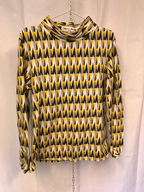 Medina har en stå krage så kallad turtleneck som går till strax under hakan. Längden går till höftområdet och passformen i tröjan är tight upptill, är mer generös över mage och höft med en smickrade formad sida. Ärmlängden är hellång med en lite vidare ärm som avslutas vid handleden med en liten manschett och puff på ärmen.