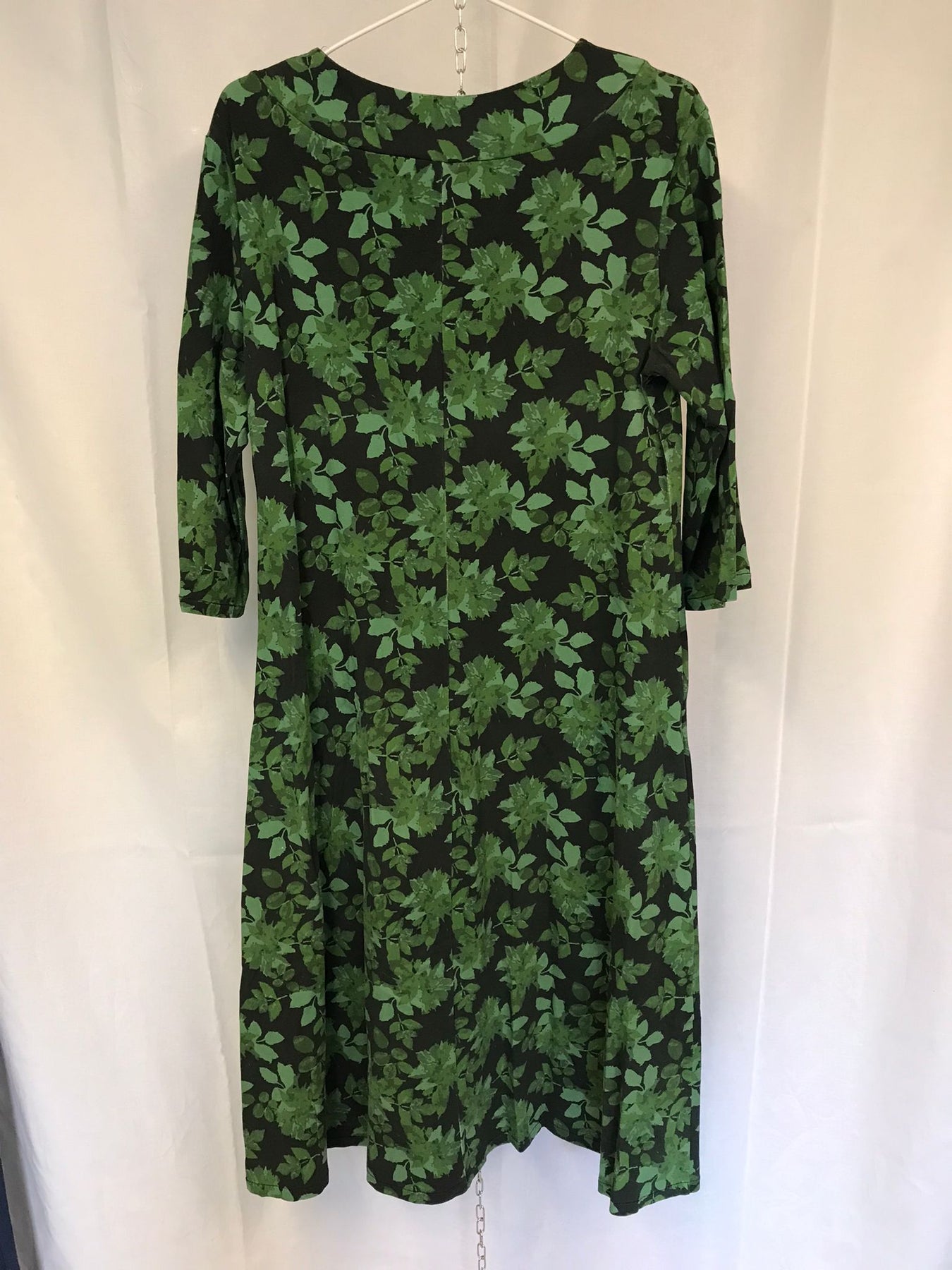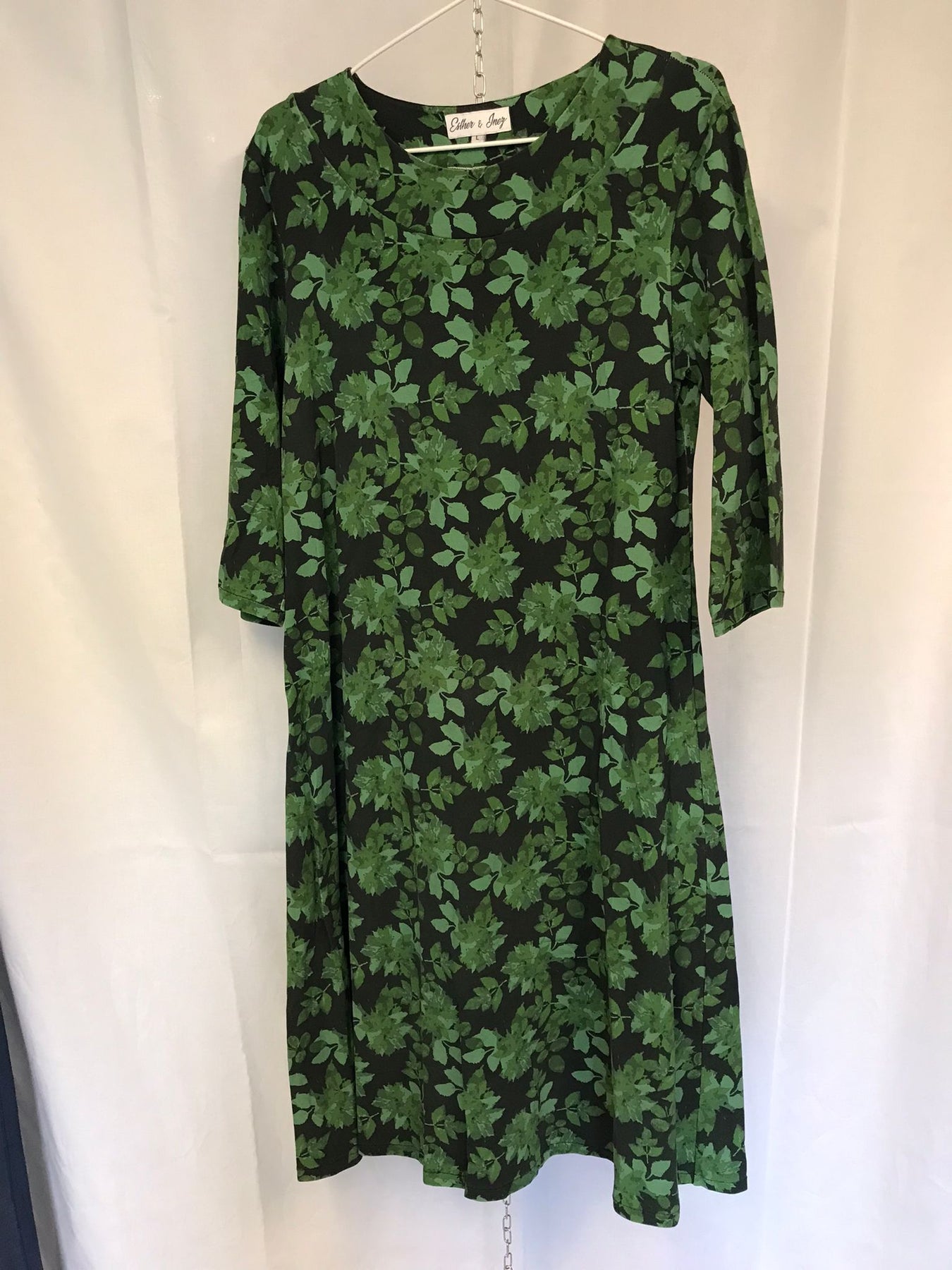 Klänning Sara slutar strax ovanför knät och båthalskragen är vändsydd. Längden gör att den funkar lika bra barbent som med strumpbyxor och leggings. Och på vintern hur bra som helst ihop med jeans! Kjoldelen är lite lätt utställd för fint fall och passformen är tajt över byst och arm för att sen släppa och bli lösare över mage och rumpa. Halsringningen är klassisk båthals som ligger på lagom avstånd från halsen, utan att ligga på men ändå täcka bh-band.