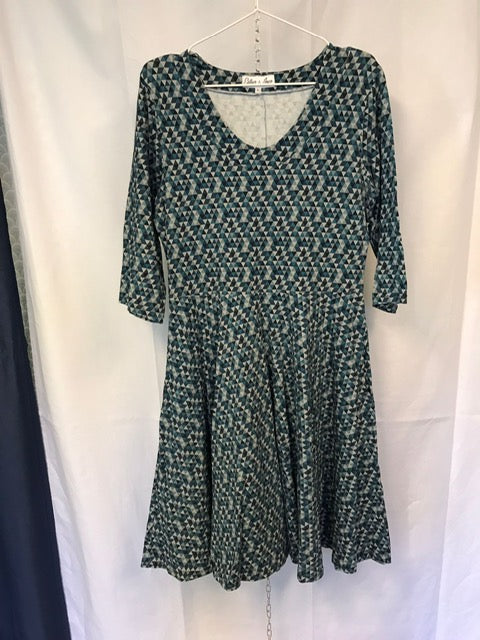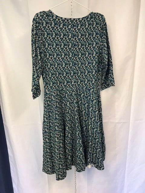 Vändsydd krage med djupare urringning framtill. Sidfickor och midjeskärning ihop med klockad kjol. Kjolen går till strax under knät och passformen i klänningen är tajt upptill med lös kjolpassform.