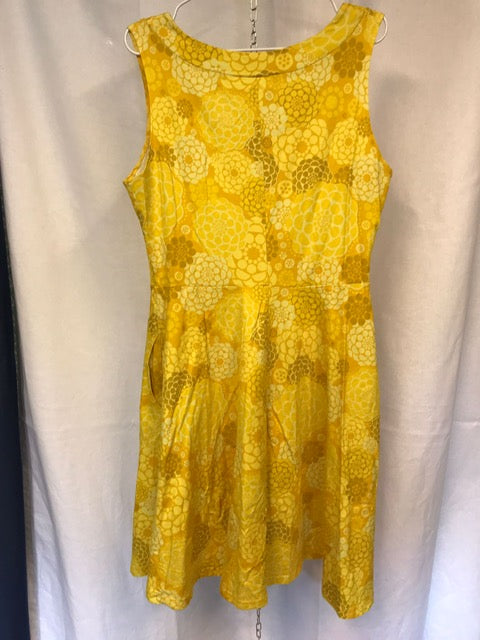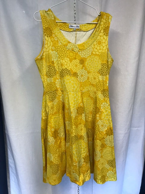Stina har vändsydd krage med djupare urringning framtill. Sidfickor och midjeskärning ihop med vid, klockad kjol. Kjolen går till strax under knät och passformen i klänningen är tajt upptill med lös kjolpassform.