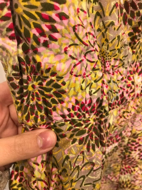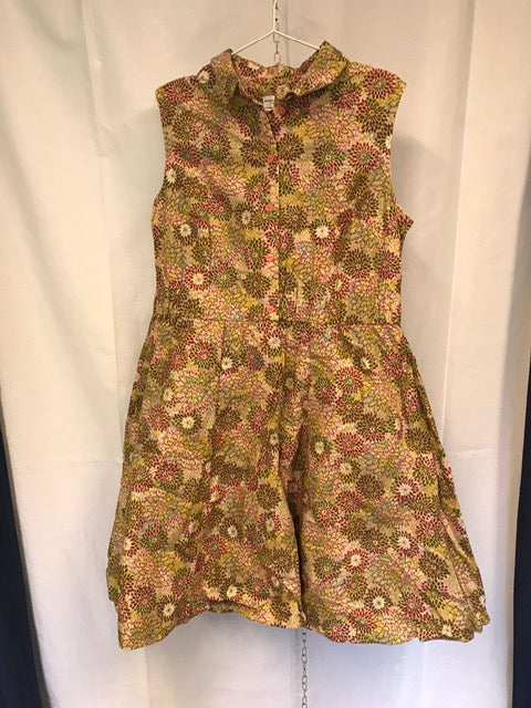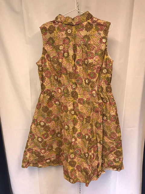 Vävd klänning i rosablommigt tyg. Har fickor och klockad kjol samt en bred resår i midjan för en snygg figur. Har även en snygg krage och knappar fram. Se bilder för fler detaljer.