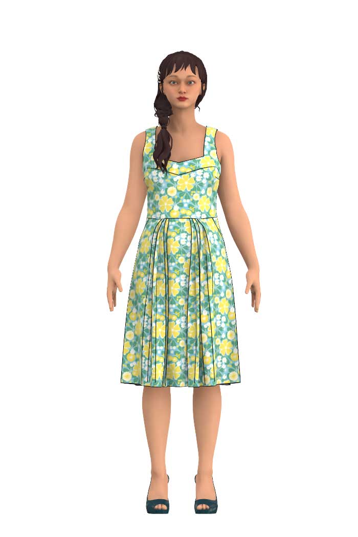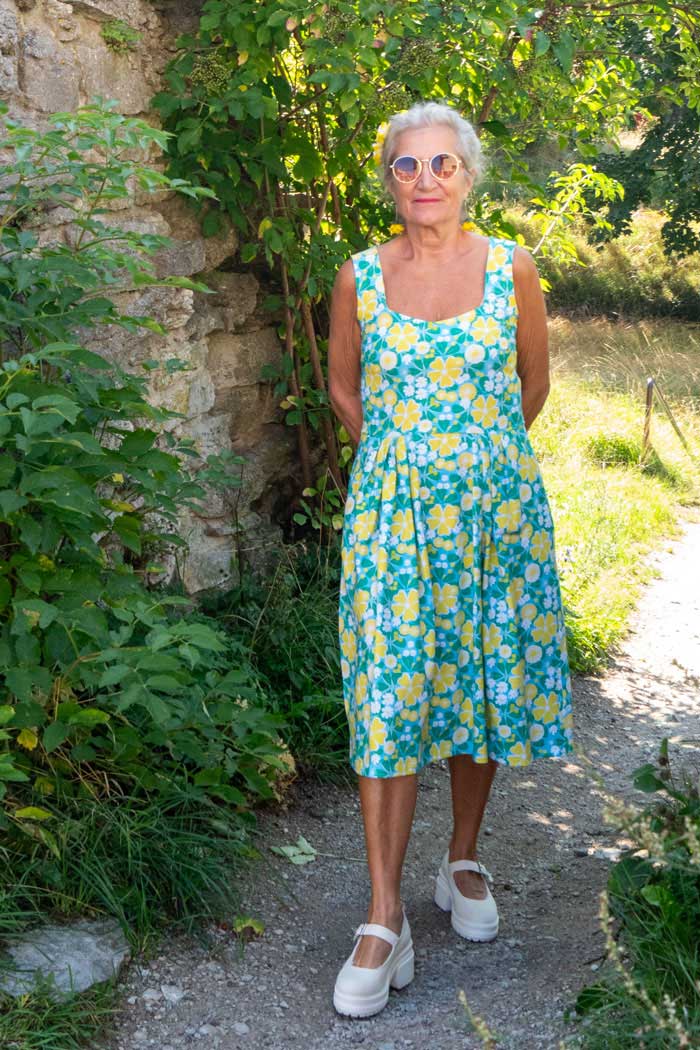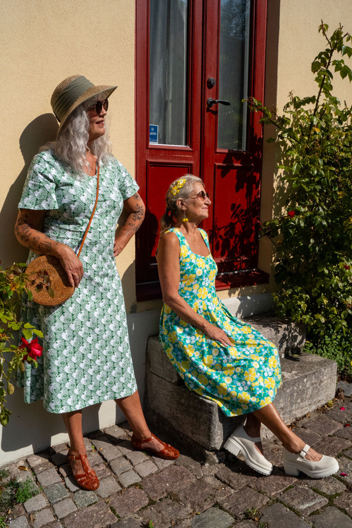 Klänningen är designad och inspirerad av vår grundares morfars mor, Gerda, som gärna bar dessa klassiska sommarklänningar med rak kjol, lagda veck och markerad midja på varma sommardagar hemma på gården utanför Enköping.