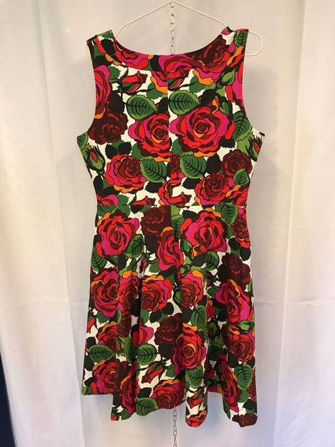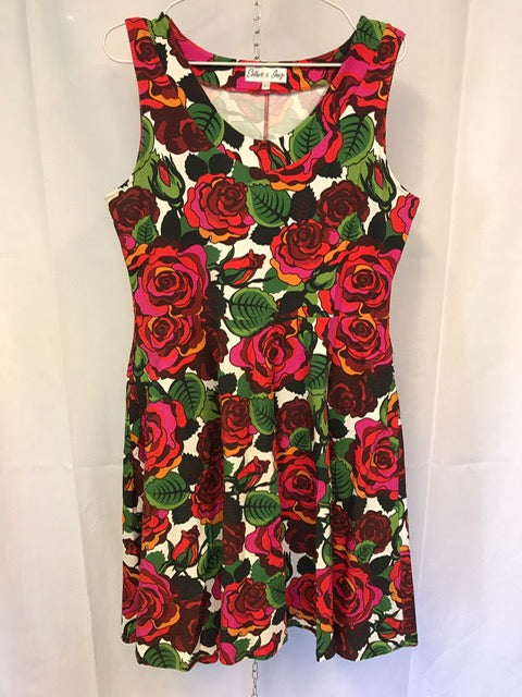 Stina har vändsydd krage med djupare urringning framtill. Sidfickor och midjeskärning ihop med vid, klockad kjol. Kjolen går till strax under knät och passformen i klänningen är tajt upptill med lös kjolpassform