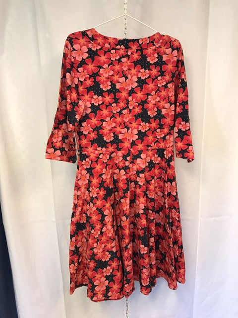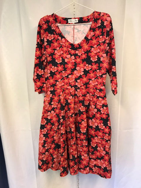 Stina har vändsydd krage med djupare urringning framtill. Sidfickor och midjeskärning ihop med vid, klockad kjol. Kjolen går till strax under knät och passformen i klänningen är tajt upptill med lös kjolpassform.