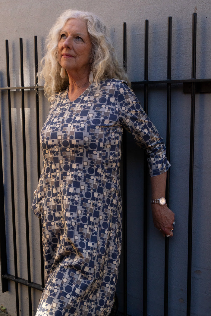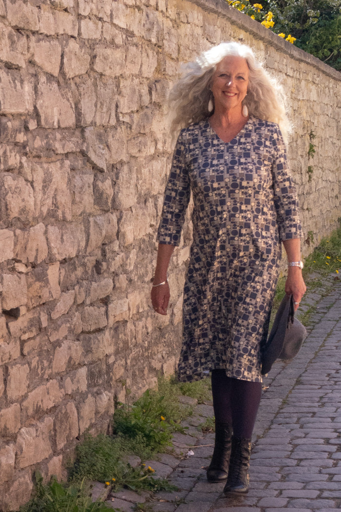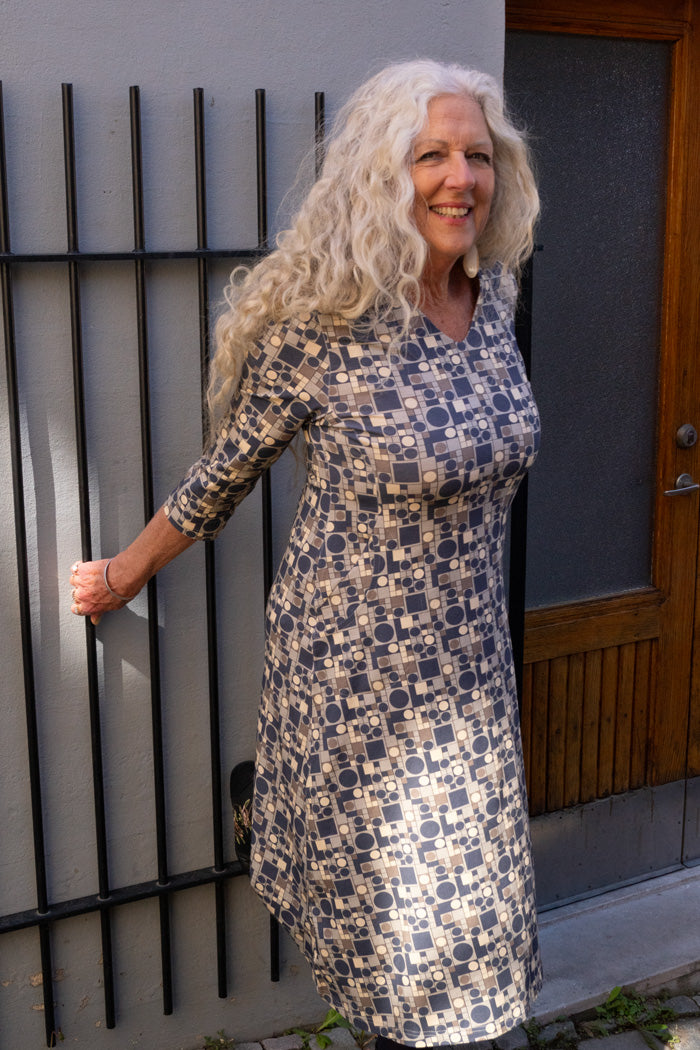Ingrid has a flattering v-neck, 3/4 sleeves, a bust cut for a nice shape and fit. And of course – pockets!