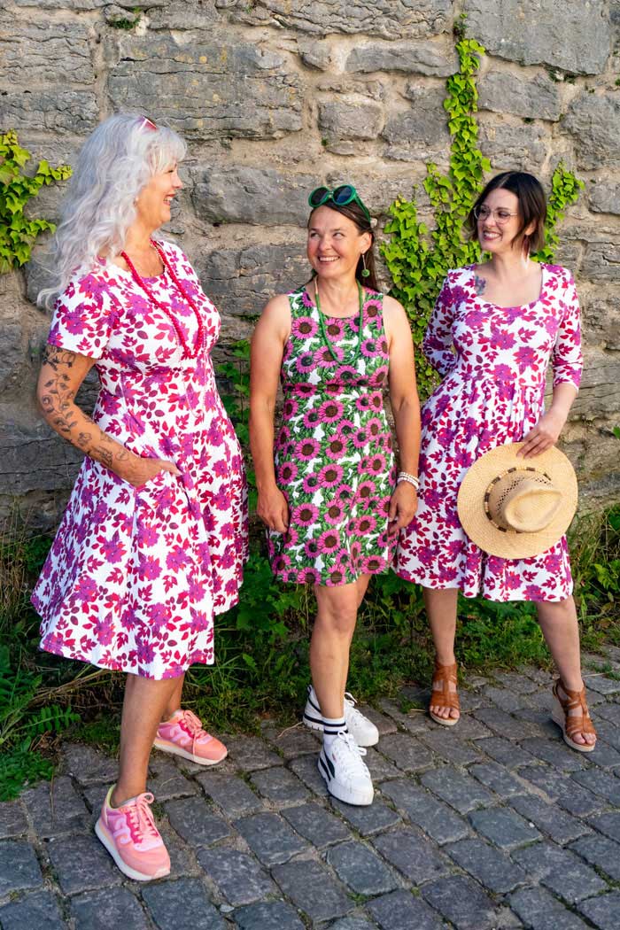 Klänning Anna är en klassisk åtsittande a-linje klänning med fickor att stoppa händerna i! Anna har en snygg rund halsringning med tajt passform upptill vid byst och lite lösare över magen och hela vägen ner ihop med sidfickor. Längden på klänningen går till strax ovanför knäet. Den perfekta sommarklänningen!
