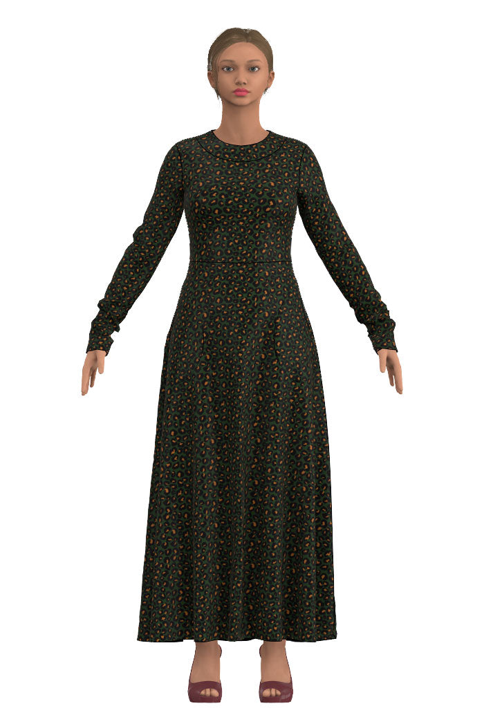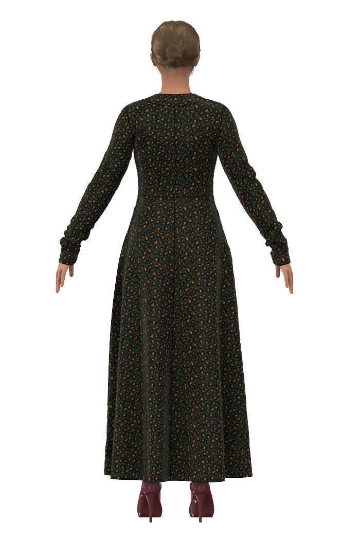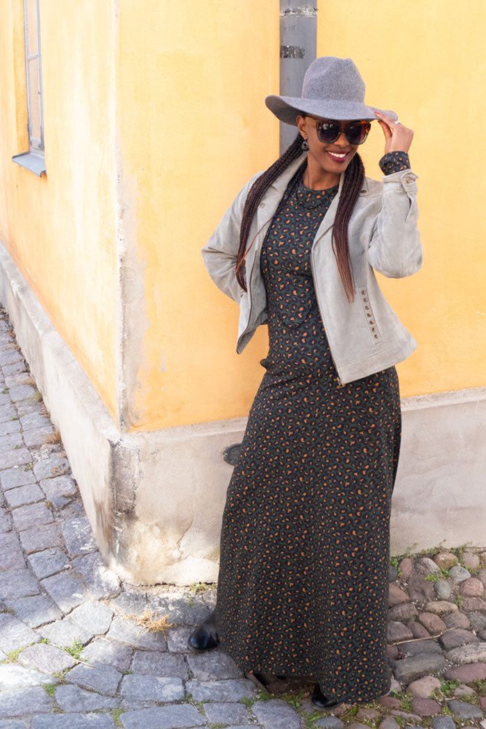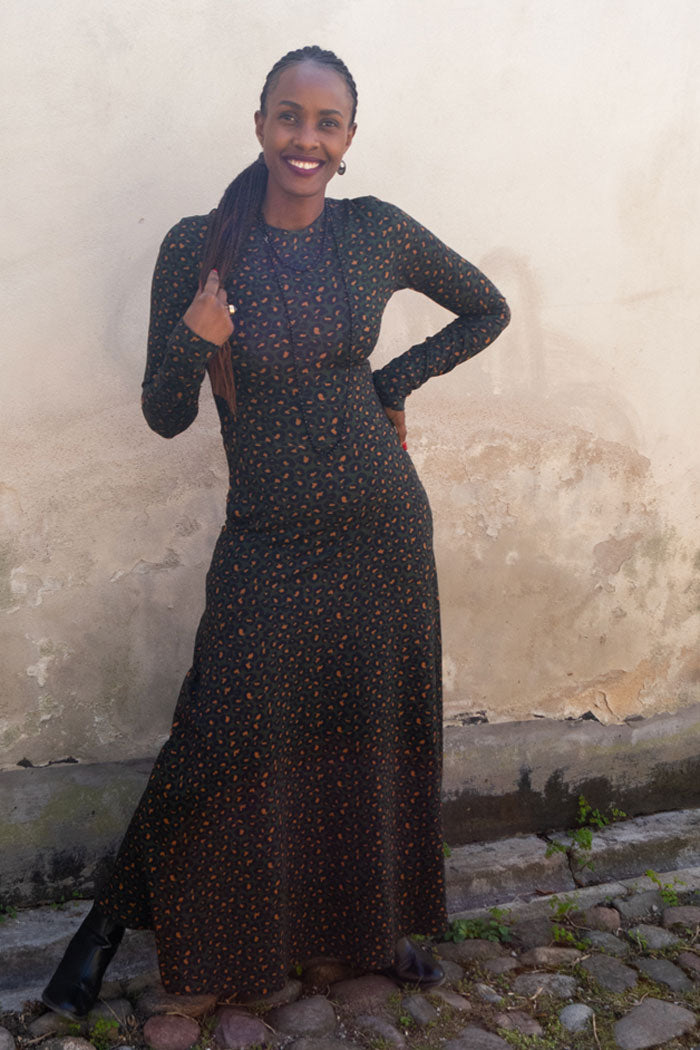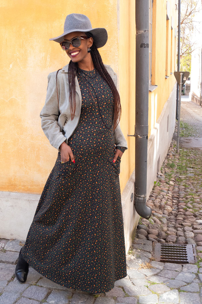 Den långa siluetten gör Beatrice till ett självklart val under höst och vinter, när man vill bära något både varmt, omfamnande och vackert. Tyget ger en mjuk tyngd som rör sig fint med varje steg, och det djupt gröna Leopold tyget ger klänningen en naturnära karaktär.
