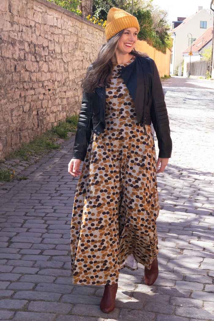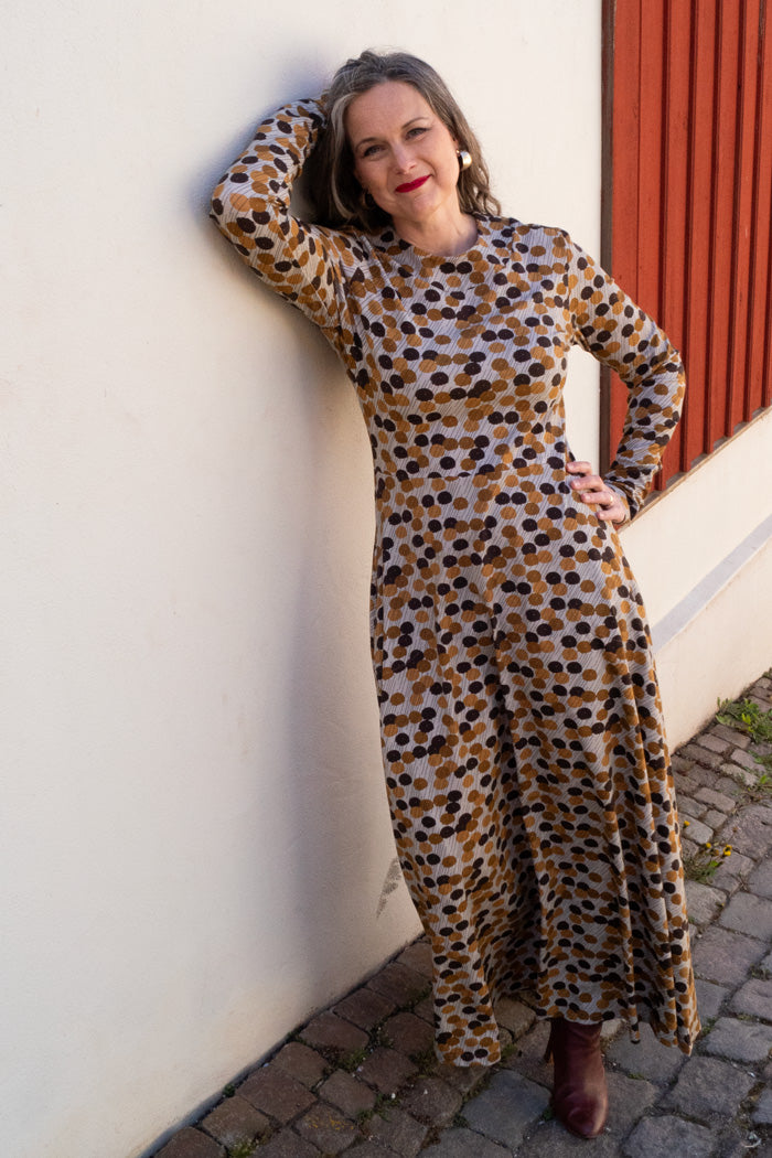 Kombinationen av det följsamma tyget, paraplymönstret och den varma färgskalan skapar ett plagg som är både uttrycksfullt och tidlöst. Beatrice Umbrella Brown är ett medvetet slow fashion‑plagg, tillverkat med ekologiska material och omsorgsfull produktion för att hålla över tid. Den passar lika bra med boots och strumpbyxor under kyligare dagar, som med accessoarer för en mer uppklädd känsla.