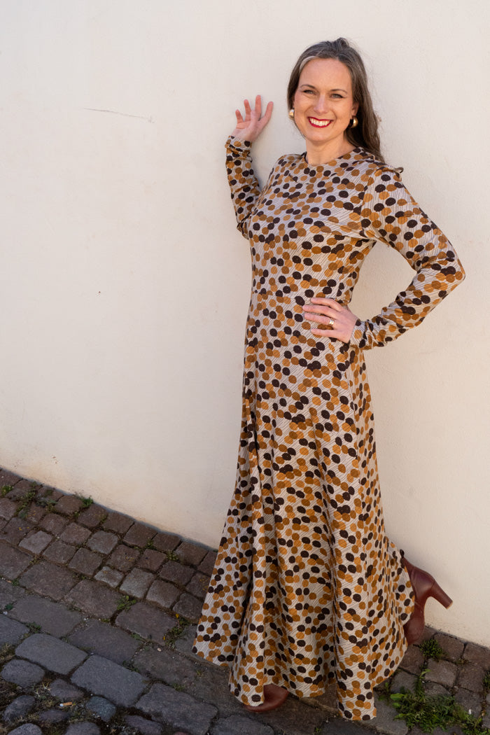 Beatrice Umbrella Brown är en lång klänning i mjuk ekologisk bomull med ett lekfullt paraplymönster i varma, jordnära bruna toner. Den långa modellen och de långa ärmarna gör den till ett perfekt val för höst och vinter, samtidigt som den behåller en elegant och smickrande siluett. Kjoldelen faller vackert och ger rörelse i varje steg, medan den avslappnade men ändå feminina passformen gör klänningen bekväm att bära hela dagen.