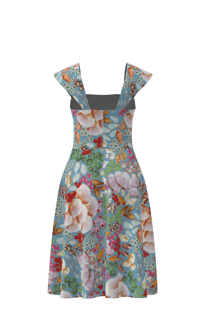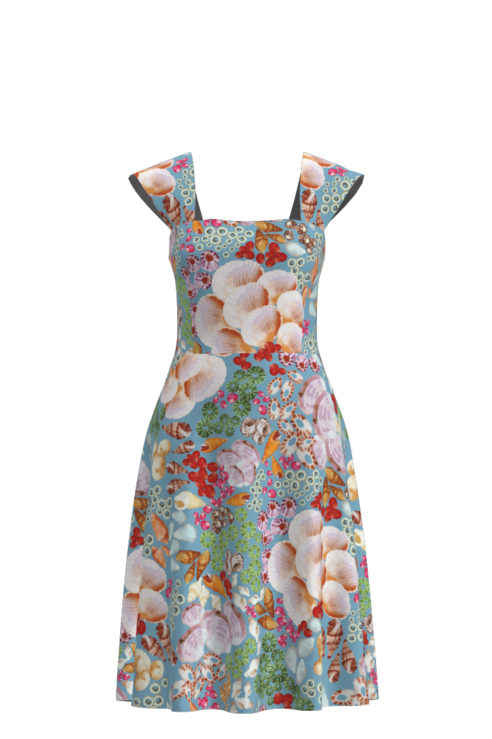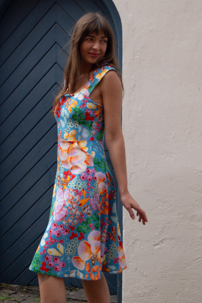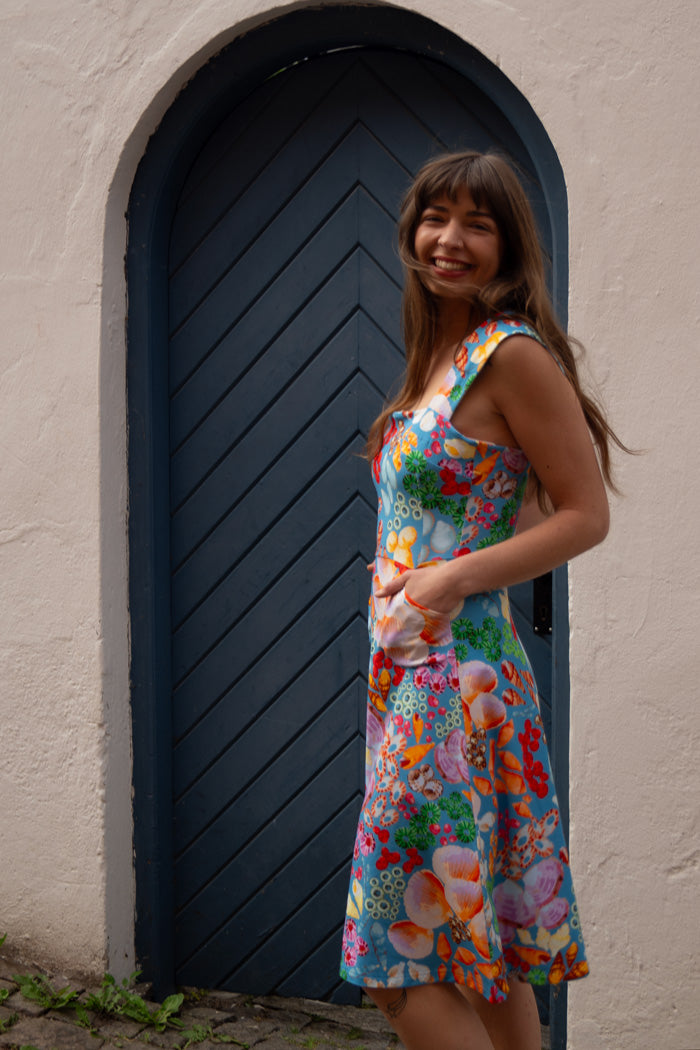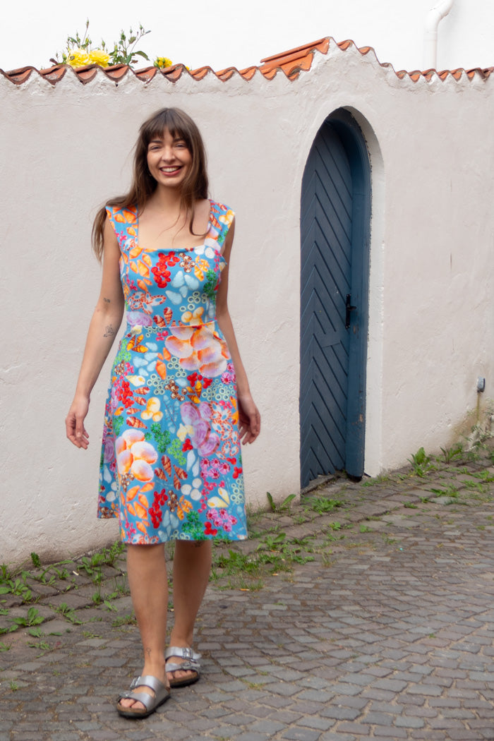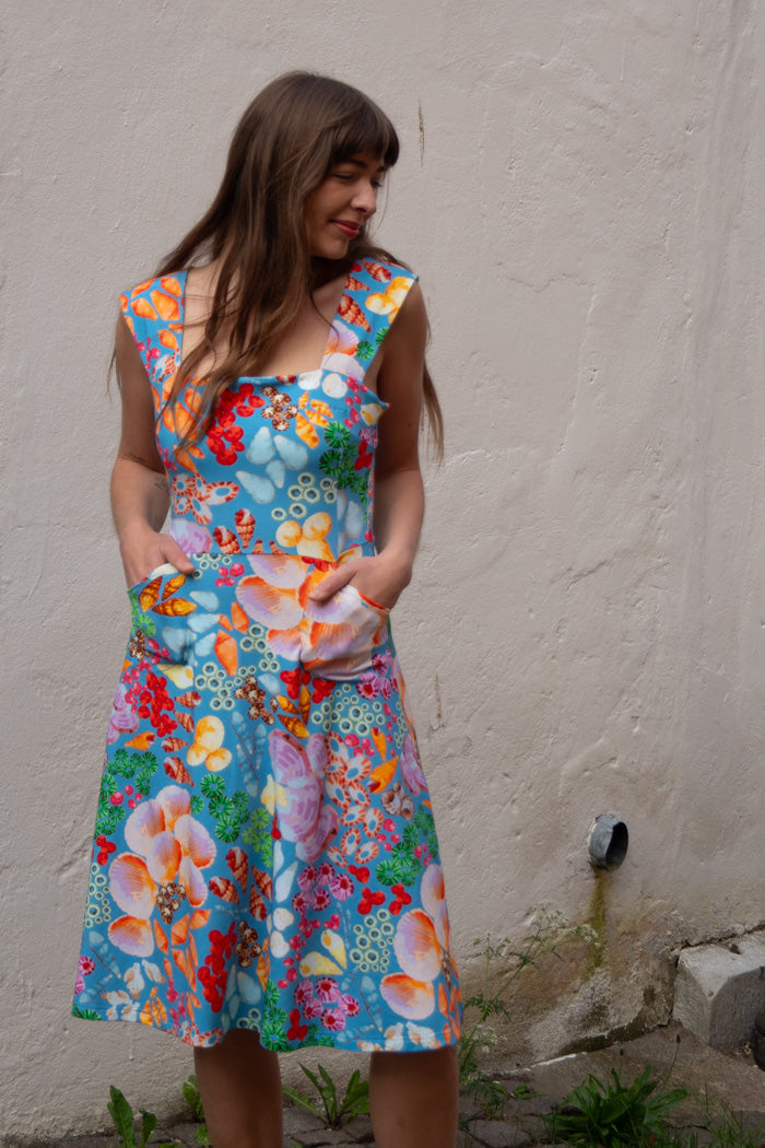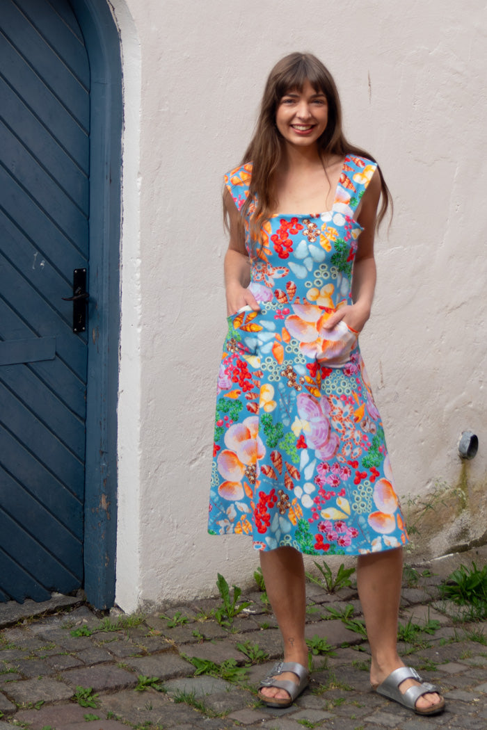 Britta har en tajt passform upptill vid byst med bystinsitt och snygga axeldetaljer. Hon har en markerad midja med en fin skärning och kjoldelen är lätt klockad för vacker passform. Fickorna sitter i sidan och längden på sommarklänningen går ner till vaden.