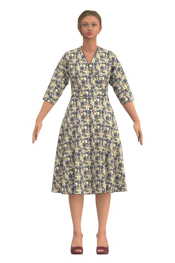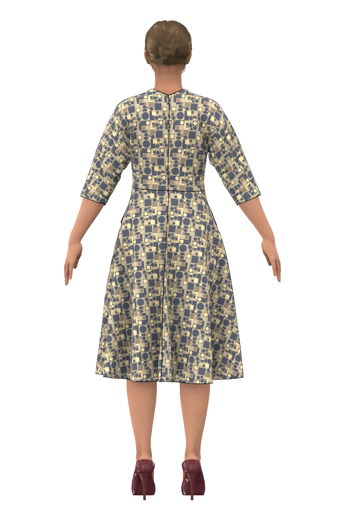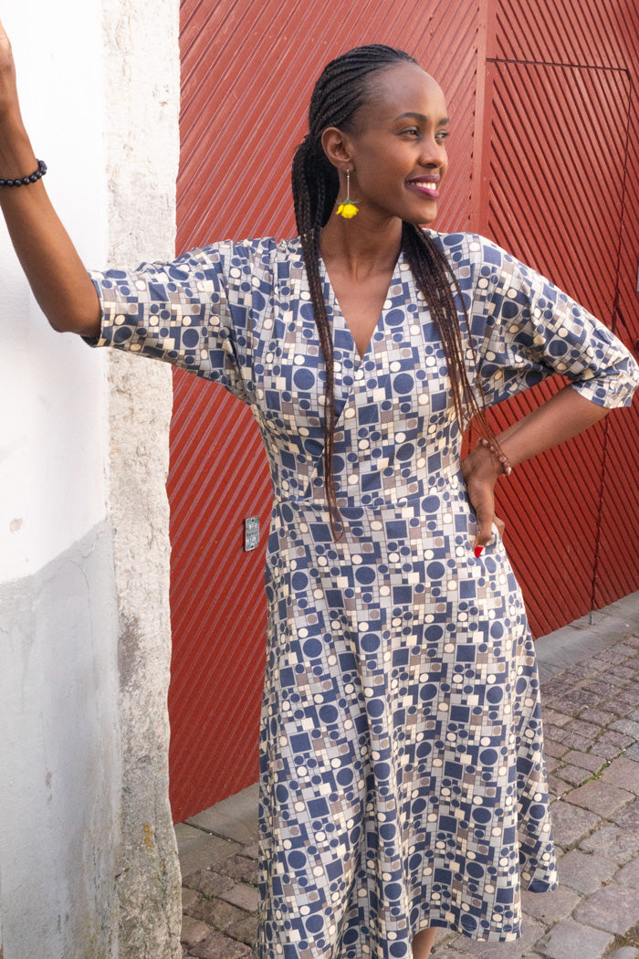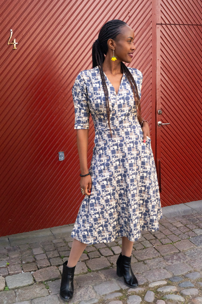 50-tals inspirerad passform och skärningar med så kallad "batwing" ärm som är halv lång med lös och ledig passform. Klänning Elsa har en markerad midja och klockad kjoldel. Omlott V-ringning fram samt en nätt V-ringning även baktill. Självklart har Elsa även bekväma fickor och bystinsitt för en smickrande passform.