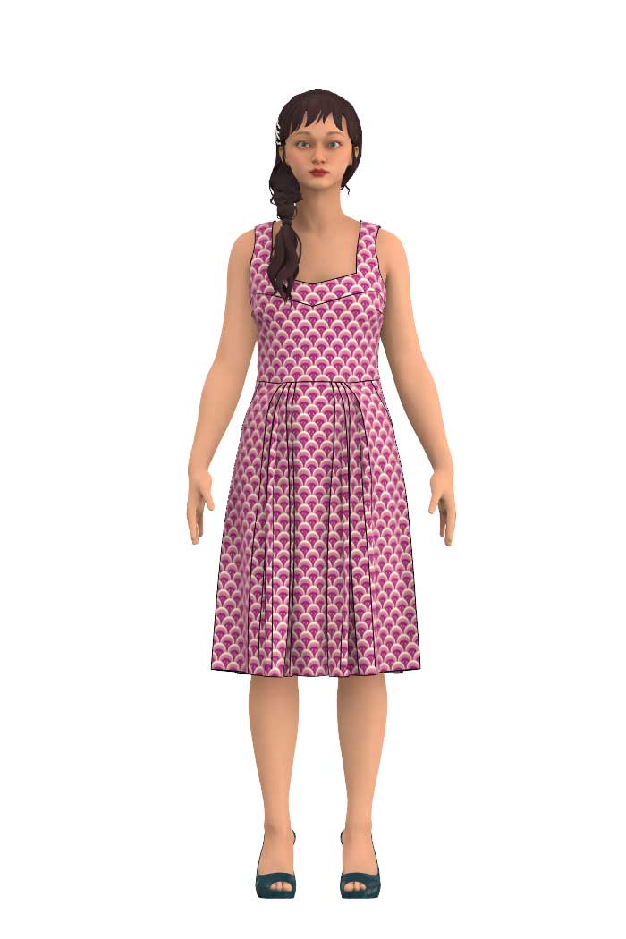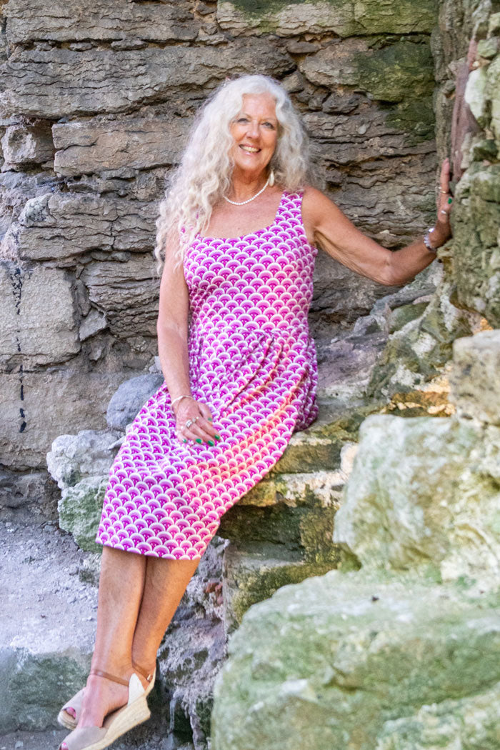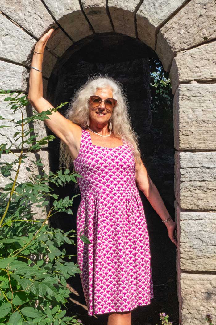 Klänning Gerda är en riktig pärla i vår kollektion, den har en djup urringning både fram och bak som passar bra med en balconette-bh och snygga halsband. Bystinsnitt för att optimera passformen och praktiska fickor fram som döljs lite av de lagda vecken. Längden går till vaden och passformen i klänningen är tight upptill och med lösare kjolpassform. Kjoldelen är rak från midjan och ner, med lagda veck. Just denna Gerda är ärmlös men modellen finns även med trekvartsärm.