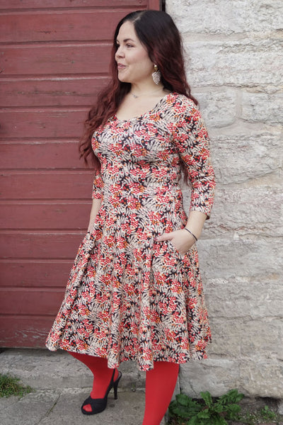 Vår egen klänning Stina med 3/4-ärm är en riktigt härlig klänning med åtsittande liv och vid kjol med vackert fall. Denna klänning har även praktiska och rymliga fickor att stoppa händerna i. Modellen är designad av Sara Högblom. Sitter skönt på kroppen med ekologisk och stretchig bomullsjersey, lika fin till vardags som till fest.